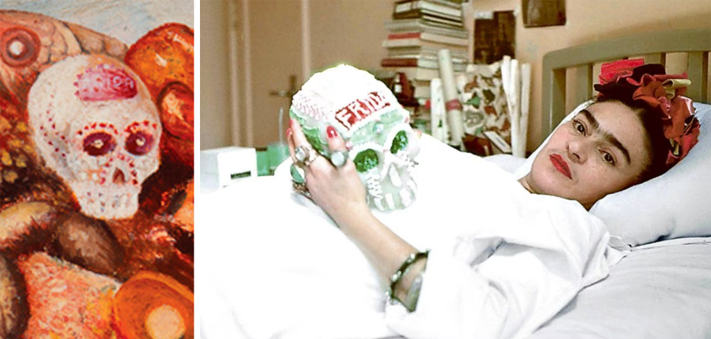 La calavera de azúcar tradicional de la cultura mexicana con el nombre Frida escrito en la frente es una alusión clara al fin de la vida.