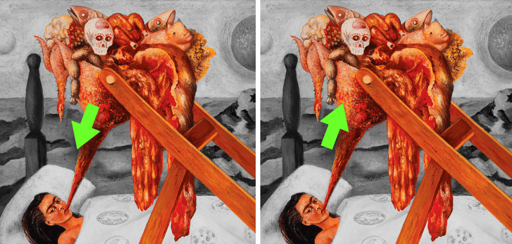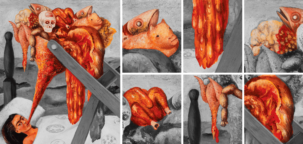 Si bien el embudo puede verso como un objeto literal a través del cual es alimentada también puede interpretarse como un vómito, este vómito cargado de comida ocupa el lugar del lienzo u obra de arte lo cual me lleva a recordar otra de sus frases famosas “La pintura ha llenado mi vida. He perdido tres hijos y otra serie de cosas que hubiesen podido llenar mi horrible vida. La pintura lo ha sustituido todo. Creo que no hay nada mejor que el trabajo.” Frase en la cual seguimos viendo su costado doliente pero también podemos ver cual es su vínculo con su obra. Puede ser su trabajo que la alimenta para seguir a pesar del dolor o también puede ser su trabajo el lugar donde se expresa y vuelva todo lo que le pasa.