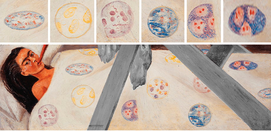En esta obra de 28 cm de alto por 36 de ancho (apenas más grande que una hoja A4) vemos el caballete que su madre mandó a construir para que Frida pudiera pintar acostada mientras se recuperaba de sus dolencias.
