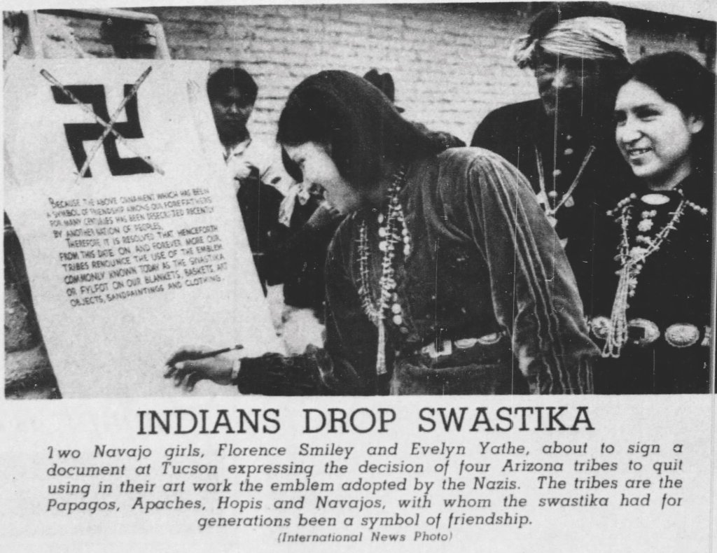 De forma similar, en 1940, varias tribus nativas americanas, como los navajos, apaches, tohono o’odham y hopi, difundieron un decreto conjunto donde renunciaban a incluir la esvástica en sus artesanías y objetos culturales, señalando que el símbolo había sido profanado.
